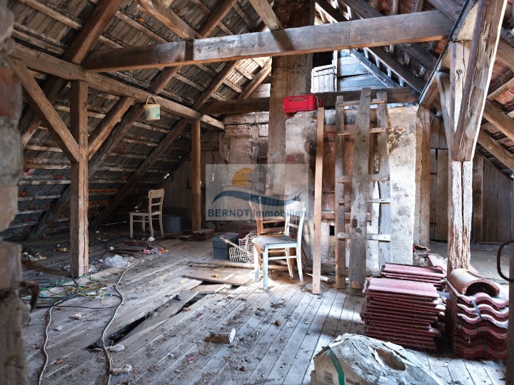 Auch die linke Haushälfte befindet sich im unsanierten/ähnlichen Zustand. Neben Flur, Bad, Kammern und Wohnküche bietet das Obergeschoss drei Zimmer mit flexibler Raumaufteilung. Alte Holz- und Kunststofffenster, Dielen- und Estrichböden sowie Holztüren unterstreichen den Charakter.