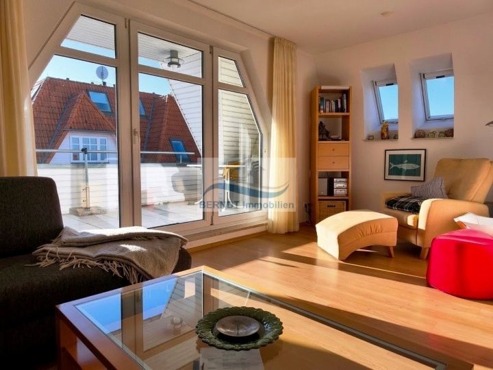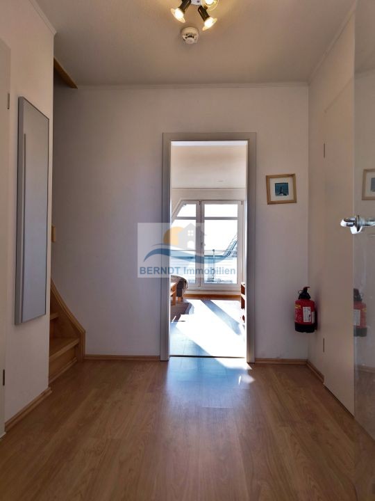Über eine Holztreppe gelangen Sie in das Dachgeschoss der Wohnung. Hier befinden sich das Schlafzimmer, das Kinderzimmer sowie das geflieste Badezimmer mit Dusche, WC, Waschtisch, Handtuchtrockner und Waschmaschinenanschluss. Besonders hervorzuheben ist der beeindruckende Ausblick vom Schlafzimmer auf den Bodden und den Hafen, der der Wohnung ihren besonderen Reiz/Charakter verleiht.