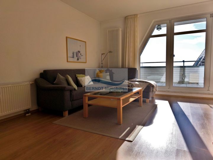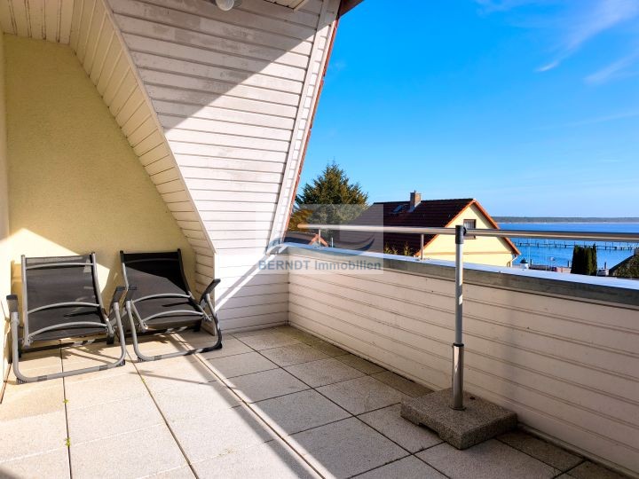 Das Herzstück der unteren Ebene bildet der großzügige Wohnbereich mit Zugang zum überdachten Balkon, der einen unverbaubaren Blick auf den Bodden und den Hafen von Breege bietet. Hier lässt sich die maritime Atmosphäre zu jeder Jahreszeit genießen.